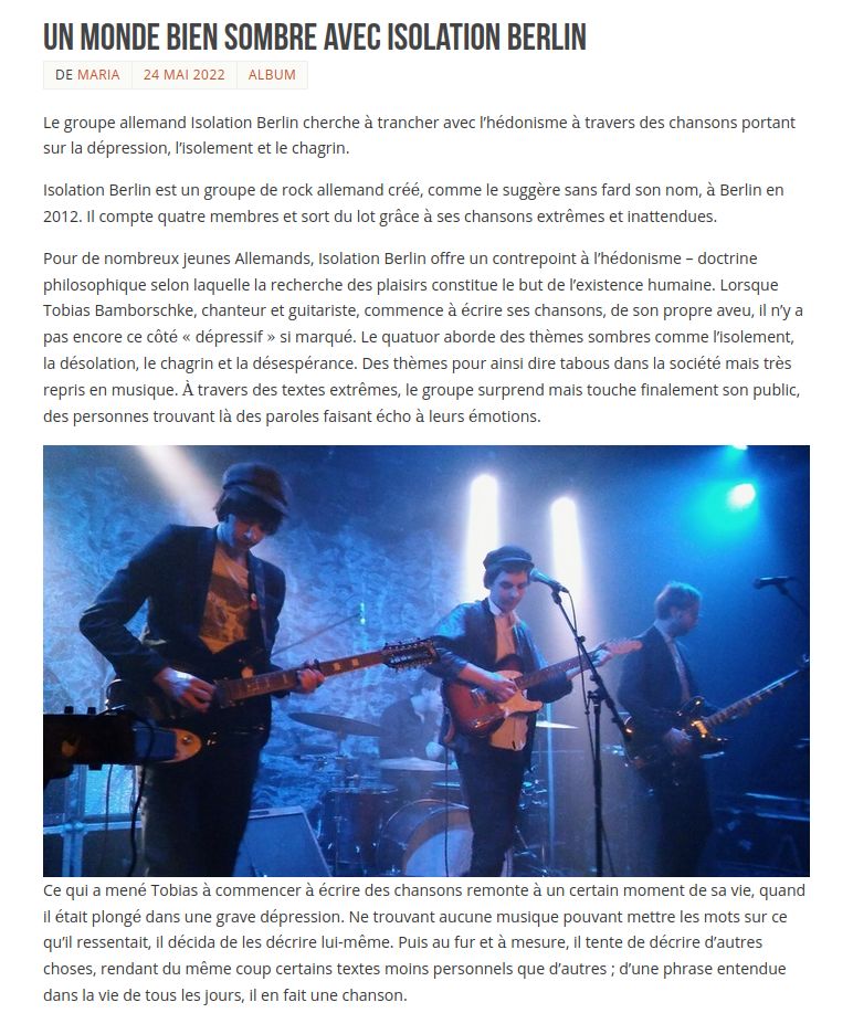 J’écrivis sur des groupes comme Isolation Berlin ou encore Casper. J’analysai aussi une musique, Lovesong de Die Ärzte. Tout cela me permit d’améliorer mon style d’écriture et de développer des compétences en recherche sur le net.