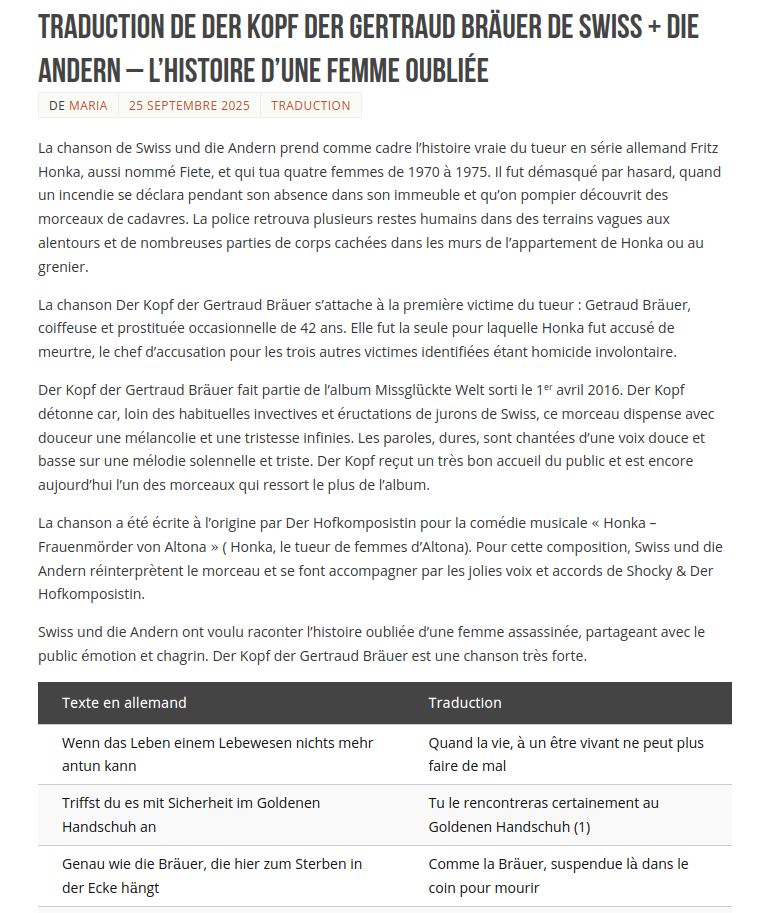 De plus, j’ai aussi fait de nombreuses traductions de musiques, Dein Lied de Madsen ou encore Der Kopf der Gertraud Bräuer de Swiss und die Andern. Ainsi, ce fut un excellent moyen d’apprendre la langue Allemande, mais également d’améliorer les compétences de traduction.